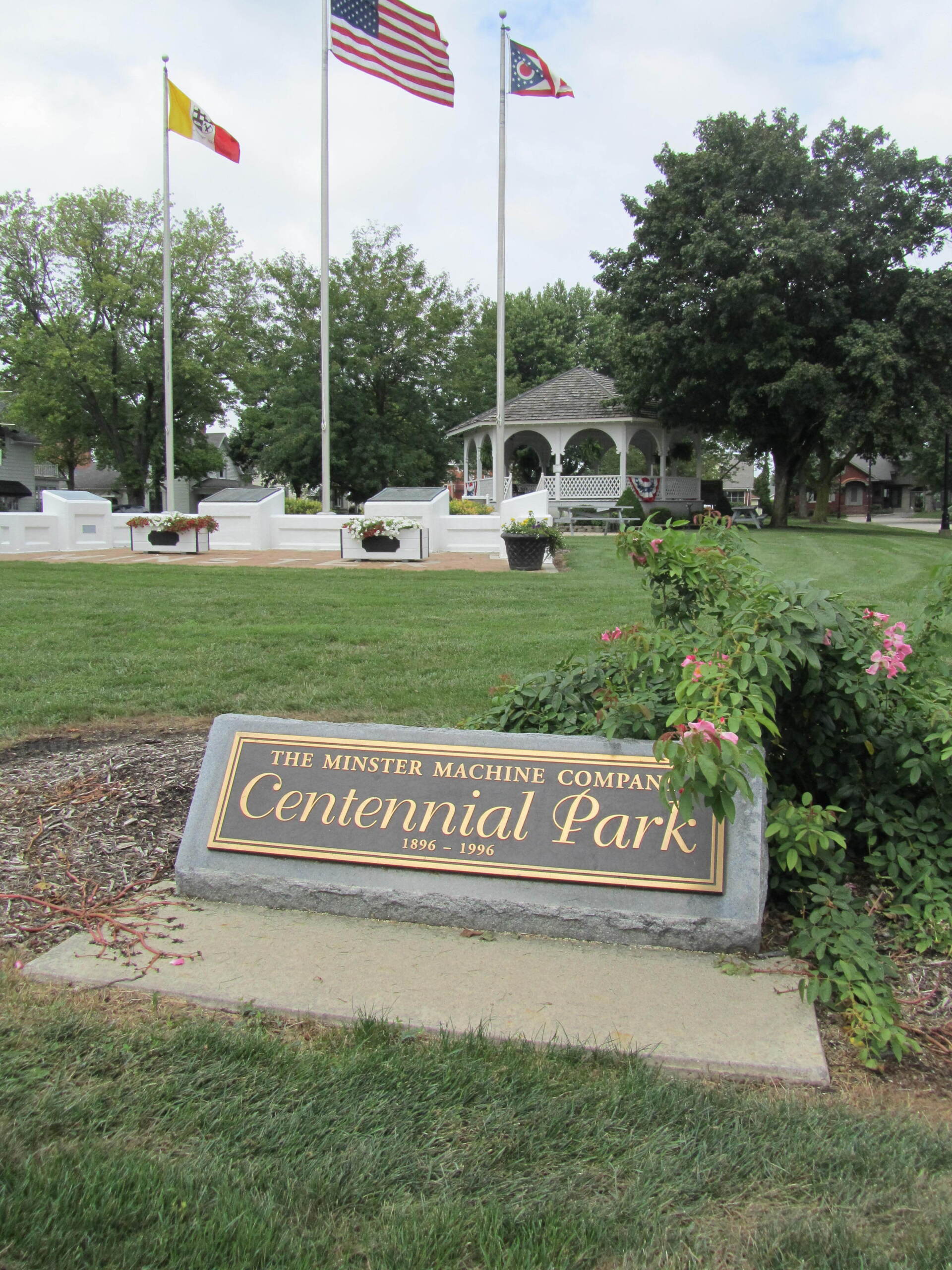 Minster Machine Centennial Park on the north of Fourth Street, features a newly remodeled Gazebo with a beautiful mosaic dance/seating area, as well as plenty of open green space for use during summer time concerts and events. Centennial Park also houses the Veterans Memorial, where we proudly raise our flags.
